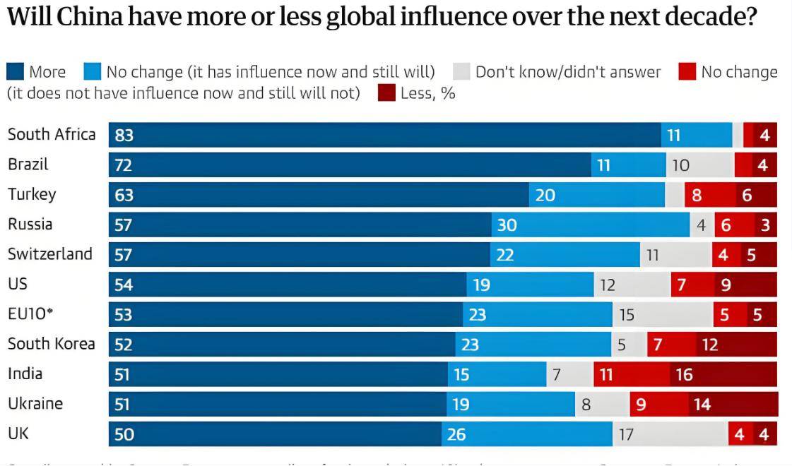 这份由欧洲对外关系委员会和牛津大学联合发布的调查,不是什么小打小闹的东西。这次他们走访了21个国家,几乎覆盖了全球,接触了近2.6万名普通民众,问了一个至关重要的问题:未来十年,谁将主导世界?结果出来时,虽出人意料,却又在情理之中。几乎所有国家的多数人都认为:中国的全球影响力只会越来越强。具体数字更是让人咋舌:83%的南非人相信中国会崛起;72%的巴西人也有同样看法;就连54%的美国人自己都承认,中国的上升势头是挡不住的;即便是以谨慎著称的英国,也有整整50%的人投下了信任票。这份调查覆盖了横跨欧美、亚非拉的广泛样本,结果出奇一致。这意味着什么?世界正在用脚投票,重新定义靠谱的大国。更值得注意的是,大家对中国的定位:除了乌克兰和韩国,绝大多数国家根本不把中国视为对手,反而越来越多的人视中国为伙伴甚至盟友。比如,85%的南非人、86%的俄罗斯人、73%的巴西人,明确表示中国是必要伙伴或可靠盟友。为什么?因为与中国合作,不仅有项目,还有技术,还有市场,能实实在在地共赢。
