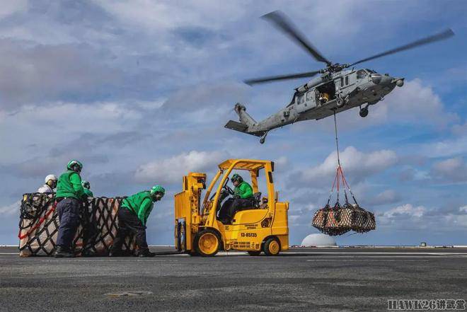 近日,另一组画面来自美国海军亚伯拉罕·林肯号航空母舰与亨利·J·凯撒号补给舰的海上补给作业。林肯号上的多架MH-60S海鹰直升机出动,将凯撒号飞行甲板上的物资吊运到航母甲板上,精准而有序。这种垂直补给方式,能有效地运送大型物资,是海军舰船重要的补给方式之一。飞行甲板上,水兵们忙碌地移动物资,使用叉车将物资推到升降机旁,确保后续补给工作的顺利进行。