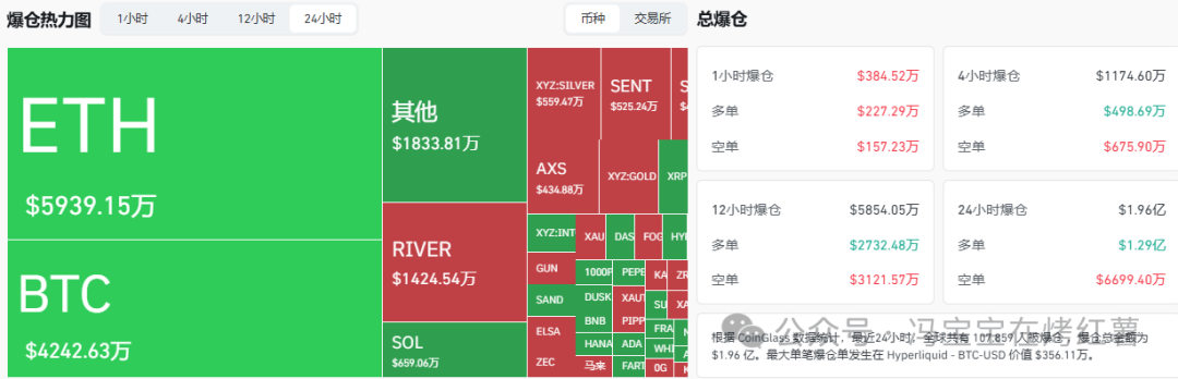 过去24小时全网共有107,859人被被爆仓,爆仓总金额为$1.96亿美元,多单爆仓1.29亿美元,空单爆仓6699.40万美元。