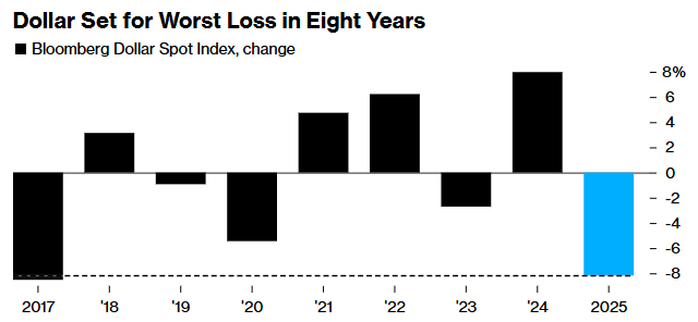 智通财经APP获悉,美元正面临八年来最大幅度的年度下跌,投资者表示,如果下一任美联储主席如预期般选择更大幅度的降息,美元还将进一步下跌。今年以来,美元现货指数已下跌约8%。继4月份特朗普宣布“解放日”关税政策后,美元大幅下挫,随后随着特朗普积极推动明年任命一位鸽派人士担任美联储主席,美元持续承压。
