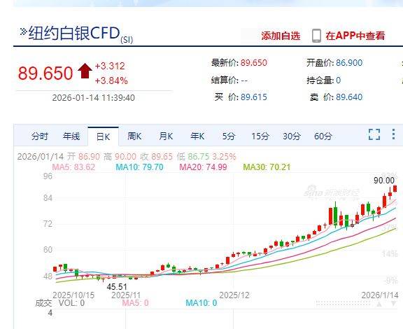 截至1月14日发稿,现货白银报89.70美元/盎司,涨3.21%。