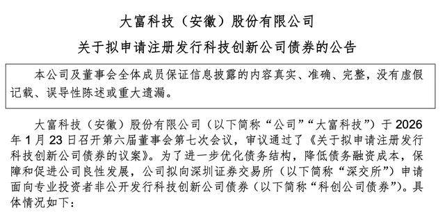 1月25日,大富科技(300134)公告,公司拟向深交所申请面向专业投资者非公开发行不超过3亿元科技创新公司债券。聘请长城证券为此次债券的牵头主承销商。