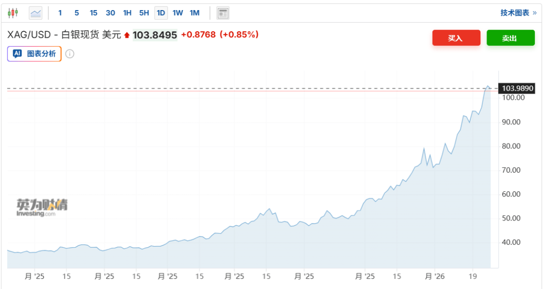 现货白银盘初再创新高,现报103.85美元/盎司。