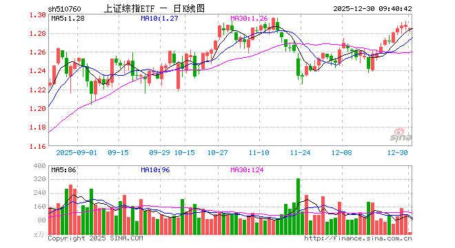 12月30日,上证综指ETF(510760)开盘跌0.39%,报1.283元。上证综指ETF(510760)重仓股方面,农业银行开盘跌0.13%,工商银行跌0.38%,贵州茅台跌0.07%,中国石油涨0.00%,招商银行涨0.07%,工业富联跌2.21%,中国人寿跌0.30%,寒武纪涨0.03%,中国银行跌0.35%,中国平安跌0.19%。