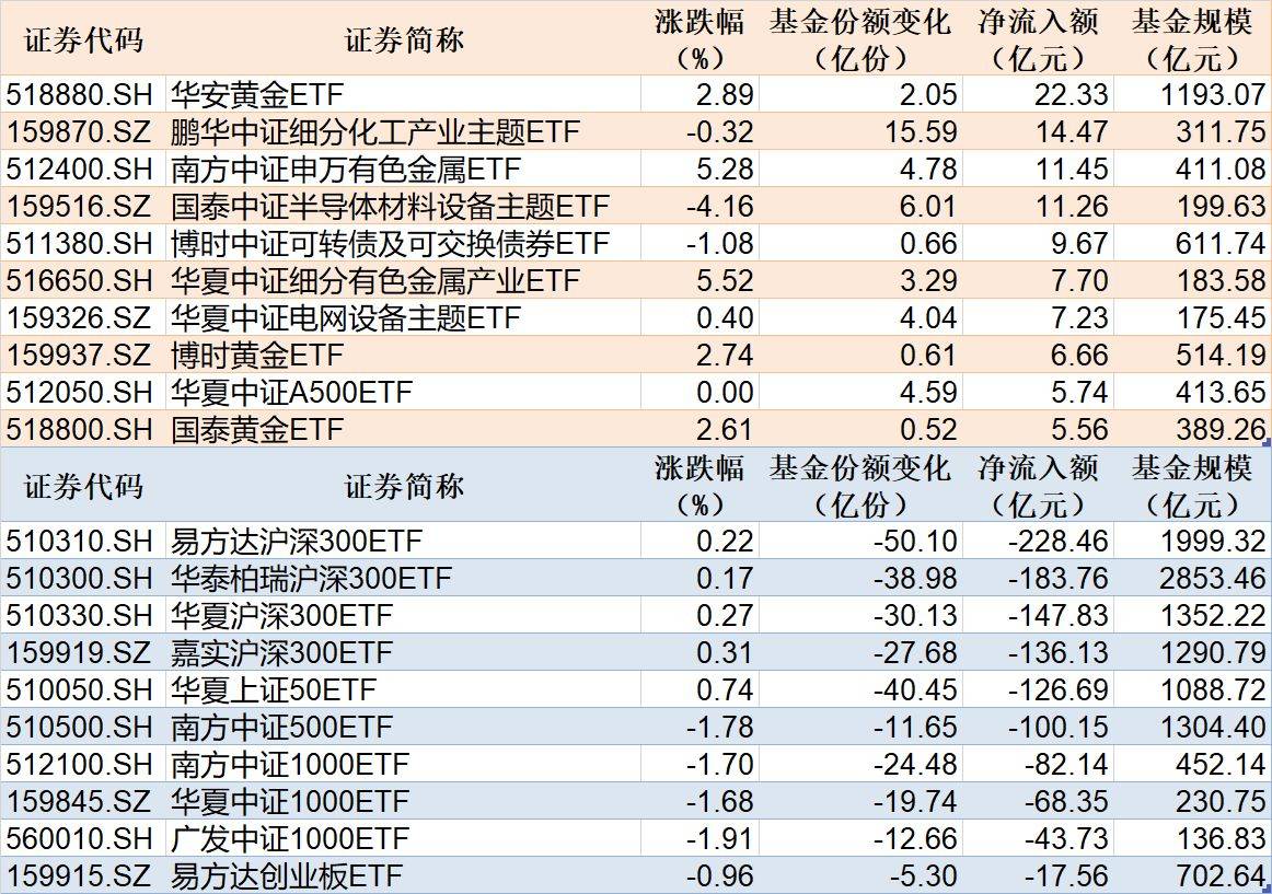 与此同时,易方达沪深300ETF基金份额减少50.10亿份,净流出额228.46亿元;华泰柏瑞沪深300ETF基金份额减少38.98亿份,净流出额183.76亿元;华夏沪深300ETF基金份额减少30.13亿份,净流出额147.83亿元。