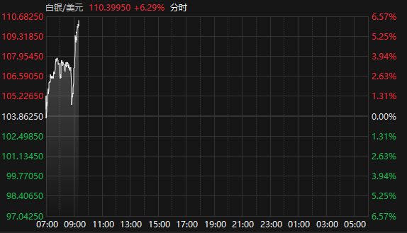 据Choice数据,1月27日早盘,国际现货白银短线拉升,截至9:21报110.399美元/盎司,日内涨超6%。