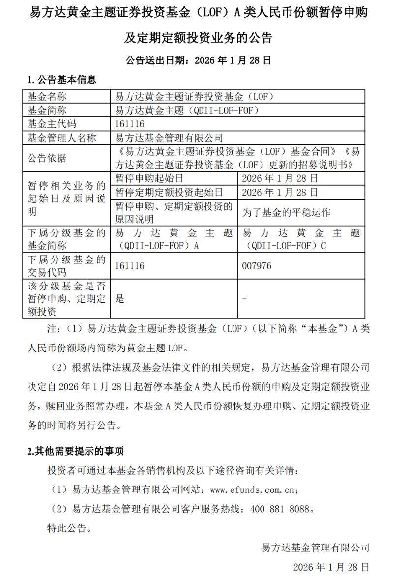 1月27日,易方达黄金主题LOF公告,1月28日起暂停A类人民币份额申购及定期定额投资业务。