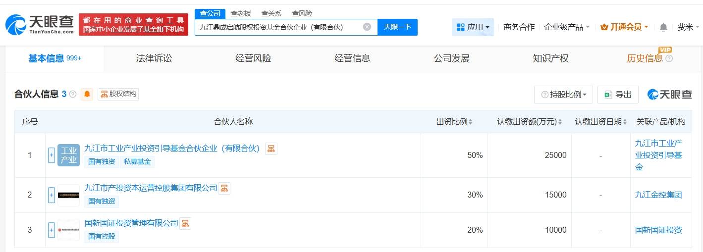 每经AI快讯,天眼查App显示,近日,九江鼎成启航股权投资基金合伙企业(有限合伙)成立,执行事务合伙人为国新国证投资管理有限公司,出资额5亿元人民币,经营范围为以私募基金从事股权投资、投资管理、资产管理等活动,由九江市工业产业投资引导基金合伙企业(有限合伙)、九江市产投资本运营控股集团有限公司、中国国新旗下国新国证投资管理有限公司共同出资。