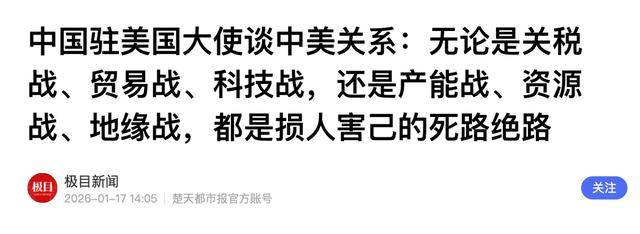 《极目新闻》:中国驻美国大使谈中美关系:无论是关税战、贸易战、科技战,还是产能战、资源战、地缘战,都是损人害己的死路绝路