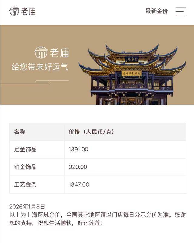 受此影响,国内金饰品牌价格也有小幅下跌。中新经纬8日查询发现,周生生足金饰品标价1394元/克,单日下跌3元/克;老凤祥足金饰品标价1396元/克,单日下跌3元/克。老庙黄金足金饰标价1391元/克,较前一日跌了11元/克,均结束此前三天连涨的走势。