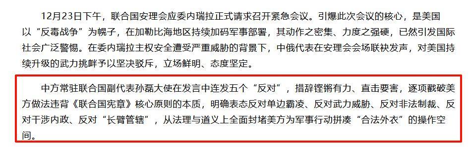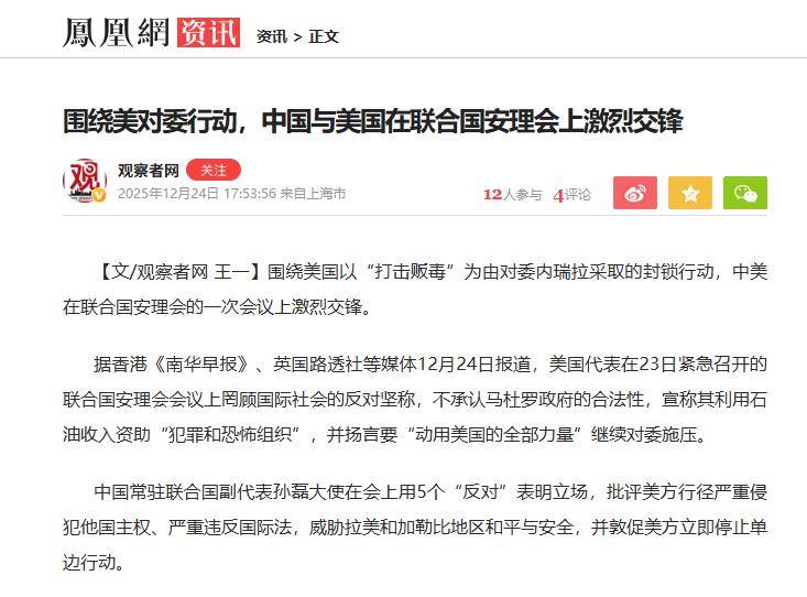 美方代表华尔兹强调马杜罗政权三大罪状:窃取选举成果、资助毒贩,以及构成最严重威胁的跨国恐怖主义和犯罪组织。 美国通过这种表态,向国际社会释放最强烈信号:如果无法推翻马杜罗政权,就不会轻易撤兵,对平民的侵害和扣押油轮的行为可能继续发生。 这也是为何委方代表蒙卡达直言,美国在加勒比海的军事行动与二战时期纳粹德国行为如出一辙,美国的目标远不止两艘油轮那么简单。 委内瑞拉在美国的军事与政治压迫下,国内局势极易动荡。美国在颜色革命方面经验老道,委内瑞拉此刻能做的,就是呼吁国际社会关注,就像近代中国历史上寻求外援以抵御侵略一样,小国在大国面前显得无力。 在联合国会议上,中俄坚定支持委内瑞拉。中方代表提出五条反对意见:反对单边霸凌、反对武力威胁、反对非法制裁、反对干涉内政、反对长臂管辖。 从批评美方行为侵犯主权到影响地区和平,中方的逻辑链条完整,信息证据充足。 俄罗斯代表则幽默地指出,美国扣押油轮和杀害平民的行为属于牛仔式行为,严重违反国际法。 至于在大国角力下小国的命运如何,目前还无法断言。加勒比海的风暴尚未真正到来,但可以观察到,美国的传统盟友已经开始出现分裂,并逐渐反对美国在该地区的行为。 例如法国代表发言时并未站在美国一边,谈到打击毒品时强调必须遵循国际法,而非单边霸凌。这说明,美国的霸权行为与盟友利益存在矛盾,越搞霸权,盟友受到的伤害越大,也就越远离美国,反过来削弱美式霸权。 目前来看,中方被扣押的油轮大概率能够回港,但原油可能无法收回。至于如何反击和补救,有一个可行方案:在近期美对台军售方案通过后,后续军火可以通过运输船进入中国海域。 届时,中国也可以采取类似美国的做法:你打击毒贩,我打击军火走私,这样的对抗在逻辑上也是合理的。 【信源:环球时报2025-12-25 安理会激辩委内瑞拉问题;观察者网2025-12-24 中国与美国在联合国安理会上激烈交锋】