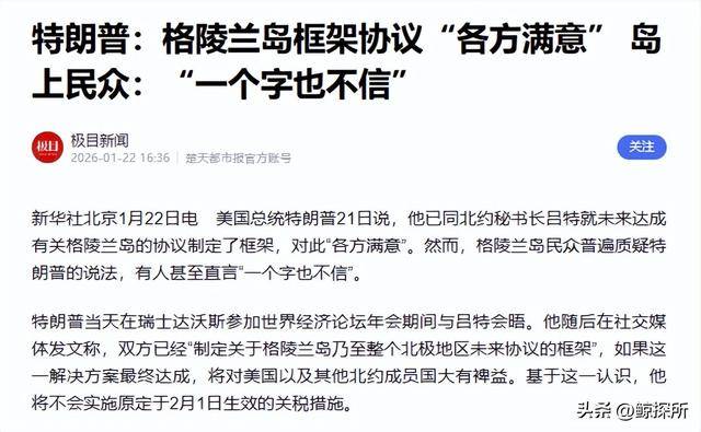 达沃斯闭门会谈刚结束,特朗普就迫不及待地晒胜利果实,宣称分文不花就拿下格陵兰岛协议框架,还吹各方都满意。