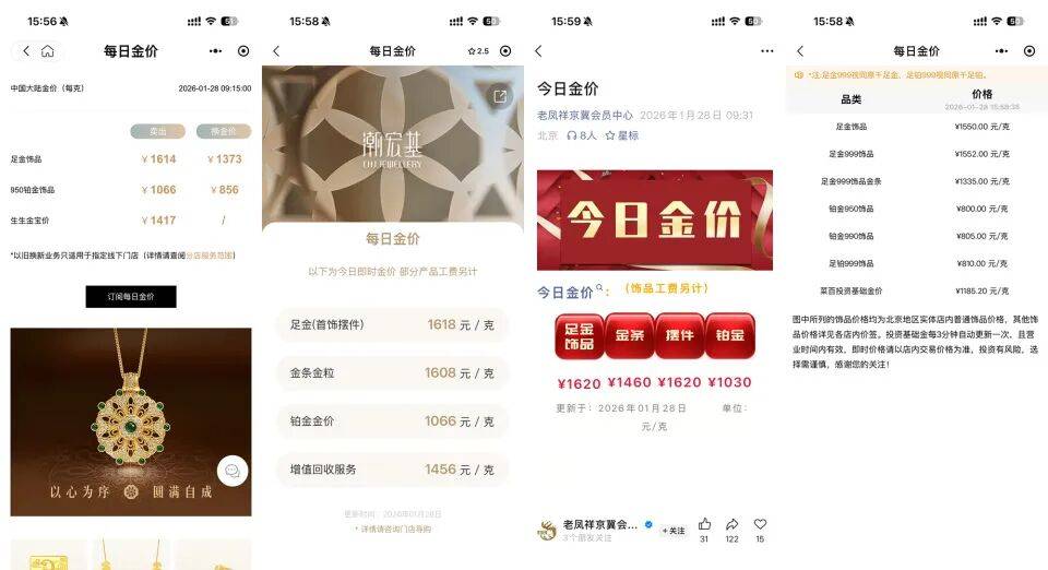国内各大品牌金饰价格继续上涨,多家突破1600元/克。具体看,老庙足金饰品价格为1618元/克;周大福饰品、工艺品类足金价格为1618元/克;周生生足金饰品价格为1614元/克;潮宏基足金(首饰摆件)价格为1618元/克;老凤祥足金饰品价格为1620元/克,菜百足金999饰品价格为1552元/克。