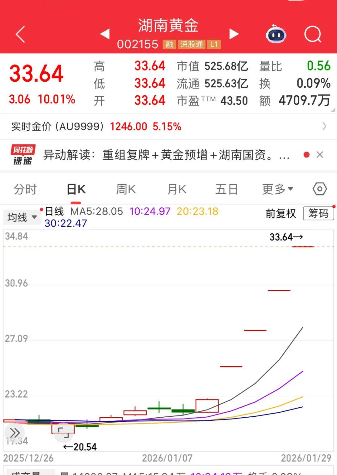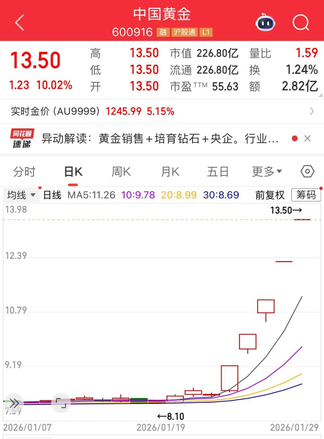 早盘,贵金属概念持续爆发,中国黄金5连板,湖南黄金4连板,晓程科技、湖南白银等多股高开。消息面上,国际黄金期货价格和现货价格29日再创新高,盘中突破每盎司5500美元。