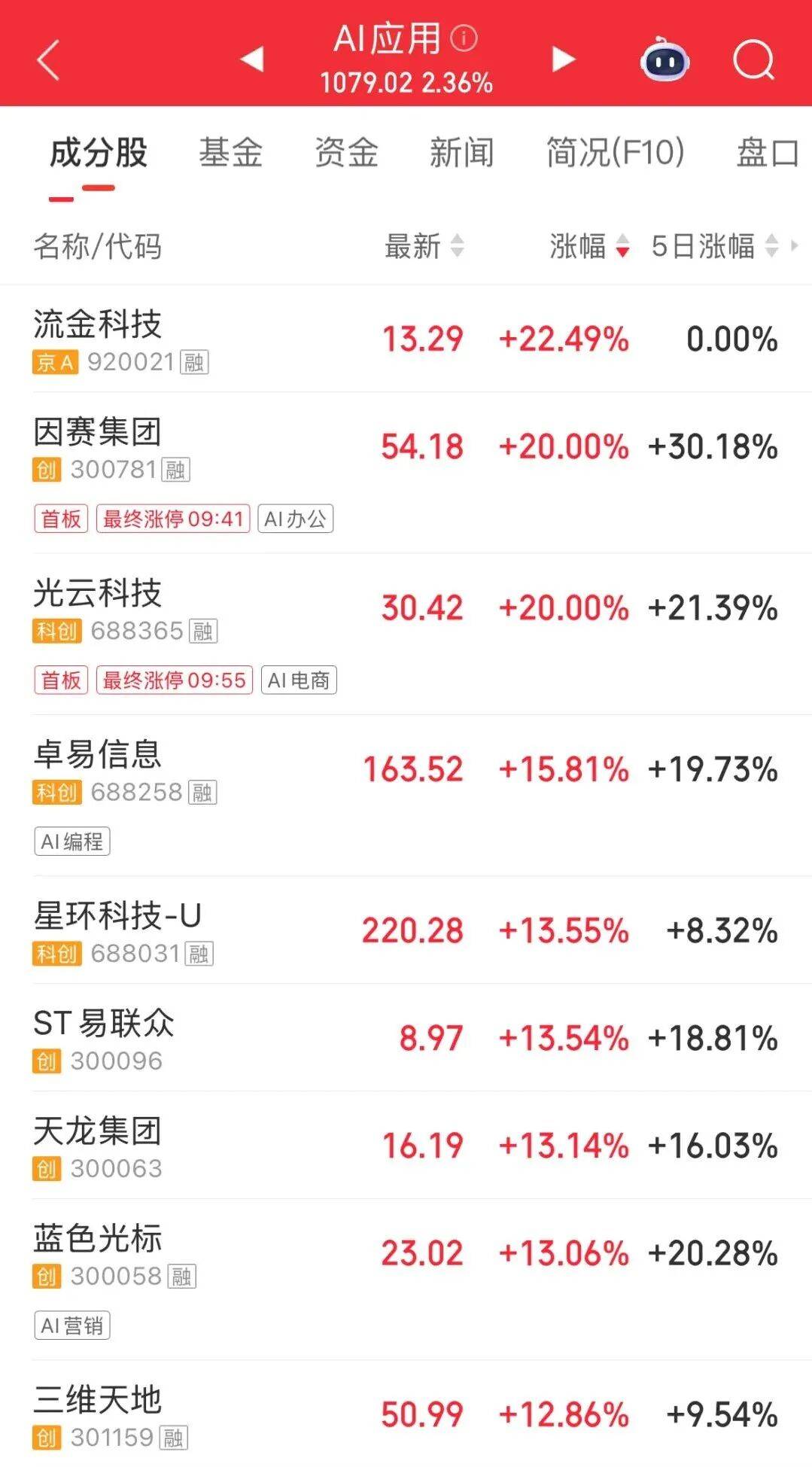 AI应用端局部异动。天地在线开盘迅速涨停,走出9天5板,因赛集团、光云科技“20cm”涨停,引力传媒、科大讯飞等多股涨停,流金科技、ST易联众、蓝色光标等跟涨。