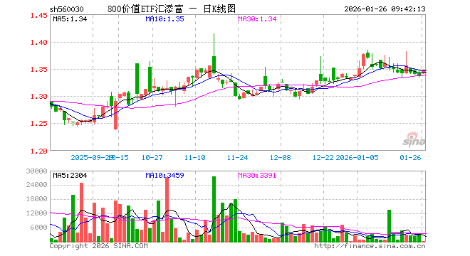 1月26日,800价值ETF(560030)开盘涨0.37%,报1.341元。800价值ETF(560030)重仓股方面,中国平安开盘涨0.16%,招商银行涨0.00%,美的集团涨0.03%,兴业银行跌0.05%,中信证券涨0.00%,工商银行跌0.28%,国泰海通涨0.00%,农业银行涨0.00%,交通银行跌0.15%,伊利股份涨0.04%。