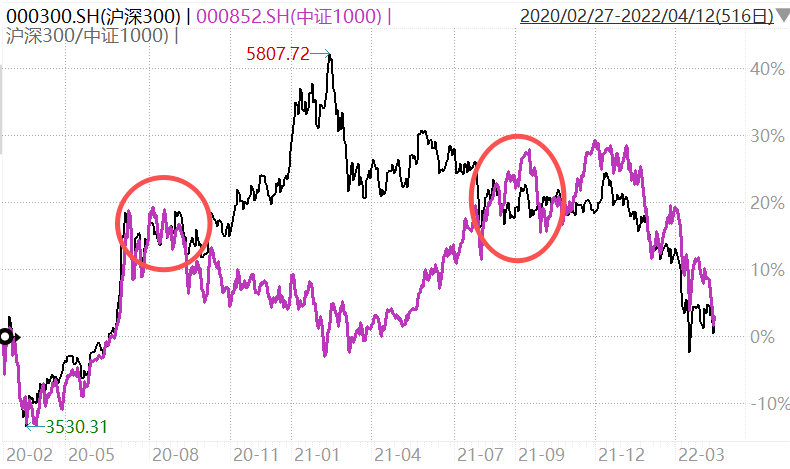 2020-2021年也是一样,核心资产牛市中,小盘股持续跑输大盘股,当时被称为“要命3000”。