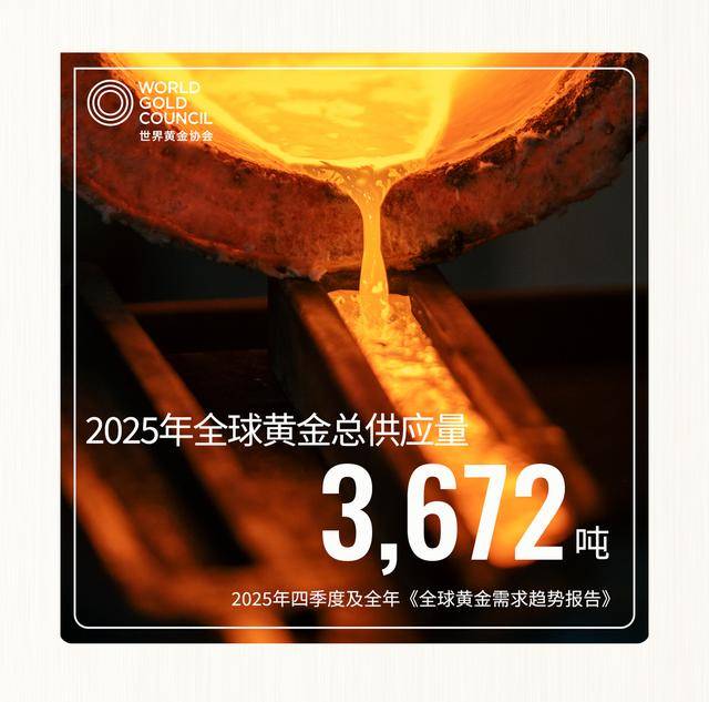 • 2025年四季度,全球黄金总供应量达1,303吨,同比增长1%;其中,金矿产量为958吨,同比增长1%;回收金总量为366吨,同比小幅增长2%。全年黄金供应总量同比增长1%,达5,002吨,同样创下新高。其中,金矿产量为3,672吨,小幅增长1%;回收金总量为1,404吨,小幅增长3%。