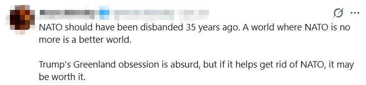 对此,有网友直呼,“北约本应在35年前就解散。一个没有北约存在的世界将会是一个更加美好的世界。特朗普对格陵兰岛的痴迷实在荒谬至极。”