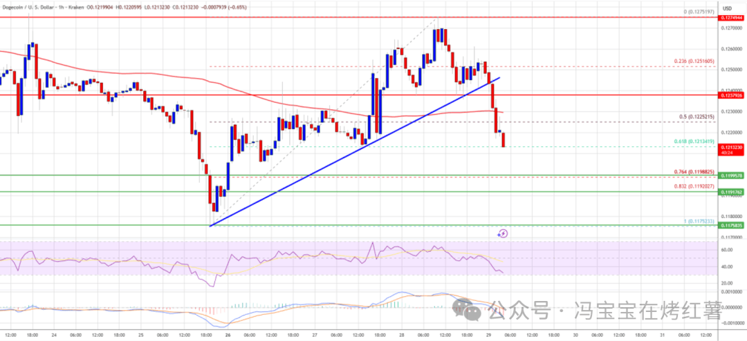 关键的技术破位已经发生,在DOGE小时图上,价格不仅跌破了0.1245支撑位,更跌破了关键的上升趋势线。这一趋势线曾被视为多头的重要防线。