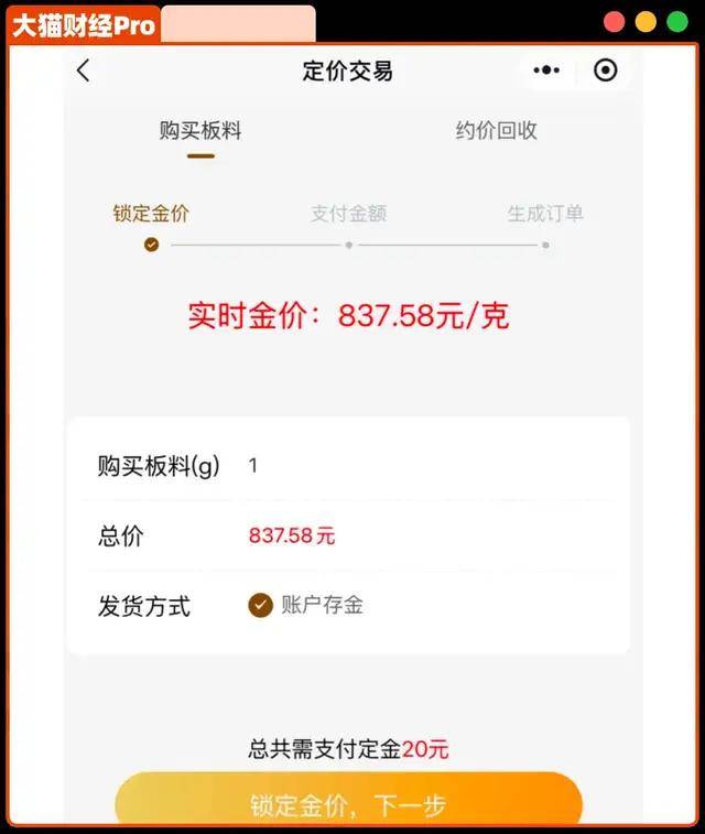比如,此时金价1000元/克,如果“看多”,可以选择支付定金“锁价”,7天后交付,金价涨到1100元的话,补全款买黄金,那么就赚了100块。