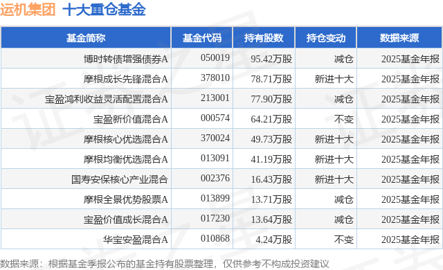 根据2025基金年报公募基金重仓股数据,重仓该股的公募基金共12家,其中持有数量最多的公募基金为博时基金的博时转债增强债券A。博时转债增强债券A目前规模为11.04亿元,最新净值2.6424(1月28日),较上一交易日上涨0.74%,近一年上涨50.61%。该公募基金现任基金经理为过钧 高晖。过钧在任的基金产品包括:博时信用债券A/B,管理时间为2009年6月10日至今,期间收益率为333.66%;博时新收益A,管理时间为2016年2月29日至今,期间收益率为273.42%;博时双季鑫6个月持有混合A,管理时间为2021年1月20日至今,期间收益率为13.11%;博时浦惠一年持有期混合A,管理时间为2022年2月17日至今,期间收益率为33.55%。高晖在任的基金产品包括:博时稳健回报债券(LOF)C,管理时间为2023年10月20日至今,期间收益率为12.87%;博时可转债ETF,管理时间为2023年10月20日至今,期间收益率为35.12%。