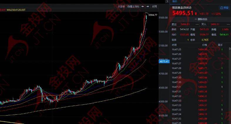 隔夜,现货黄金收盘暴涨235.97美元,涨幅4.55%,报5417.07美元。今日亚市盘中,黄金突然暴涨,一度飙升至5594.77美元,目前在5505美元附近徘徊。