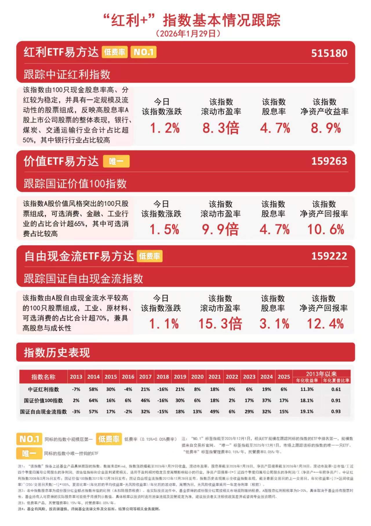 国证价值100指数采用“高分红+高自由现金流+低市盈率”三维筛选体系,优选价值标的,历史表现稳健;国证自由现金流指数则采用自由现金流率进行选样,兼具高股息与成长性。价值ETF易方达(159263)和自由现金流ETF易方达(159222)分别跟踪以上指数,可助力投资者把握相关风格投资机遇。