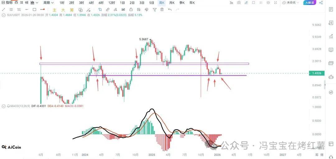 实际上sui的支撑和压力都比较明显,2.2附近是个强压,不是那么容易上去,下方支持如果破了会走的更低,不过这位置买进去盈亏比比较大。