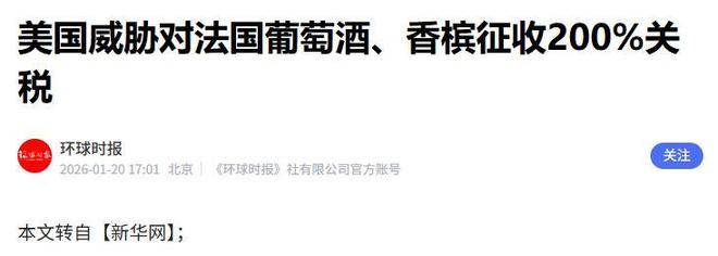 在德国选择战术撤退之后,法国如果坚持下去,将面临更大的压力。然而,正因为如此,法国的坚持显得尤为重要。至少目前,法国尚未选择屈服。 结语 从格陵兰岛到和平委员会,再到200%关税,随着这些事件的发生,美法之间的裂痕愈加明显。特朗普将关税作为政治武器,不仅让法国的酒业陷入困境,也撕裂了原本牢固的盟友关系。而背后所隐藏的逻辑,早已不再是简单的贸易问题,而是赤裸裸的你听话,我就饶你一命;你不听话,我就让你破产的威胁。 中国的立场非常明确:我们不能允许这种霸凌行径成为国际社会的新常态。法国是否会低头,尚未可知,但这场关税风暴已经足以证明,在美国主导的联盟下,是否真的安全,值得我们深思。