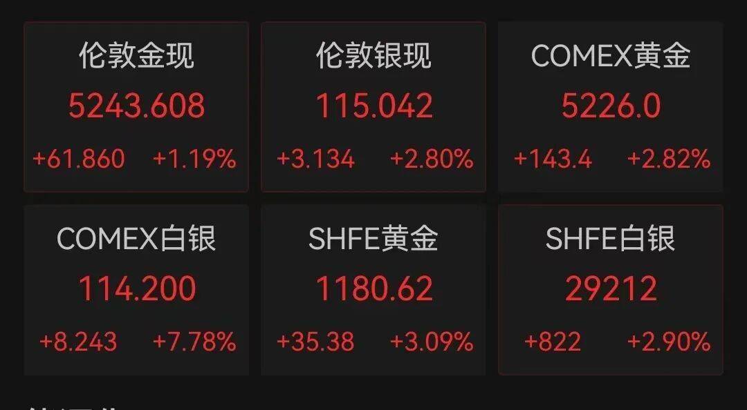 28日,现货黄金日内上涨超1%,一度达到创纪录的每盎司5247.628美元的高点,截止发稿,现报5243.608美元/盎司,上涨1.19%。现货白银日内涨幅达2.8%,现报115.042美元/盎司。