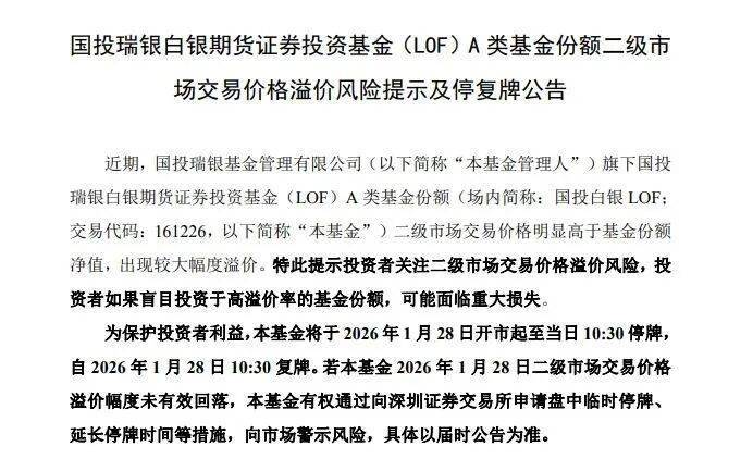 另外,1月27日,国投白银LOF公告,本基金将于2026年1月28日开市起至当日10:30停牌,自2026年1月28日10:30复牌。若本基金2026年1月28日二级市场交易价格溢价幅度未有效回落,本基金有权通过向深圳交易所申请盘中临时停牌、延长停牌时间等措施,向市场警示风险,具体以届时公告为准。
