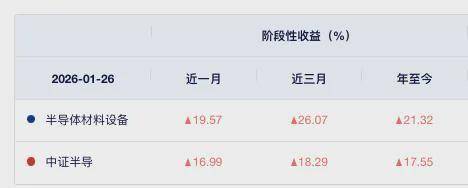 2026年以来,A股半导体板块强势开局,其中材料设备环节表现尤为抢眼。据Chioce数据显示,截至1月26日,多只半导体设备相关ETF年内涨幅超过20%,与美股半导体龙头股形成共振上涨。