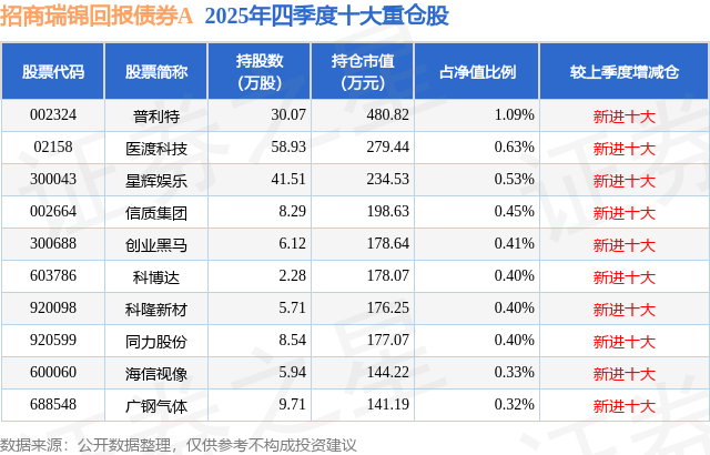 招商瑞锦回报债券A的前十大重仓股如下:
