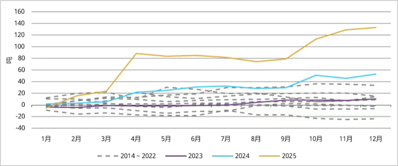 ▲黄金ETF累计月度需求量,来源:世界黄金协会