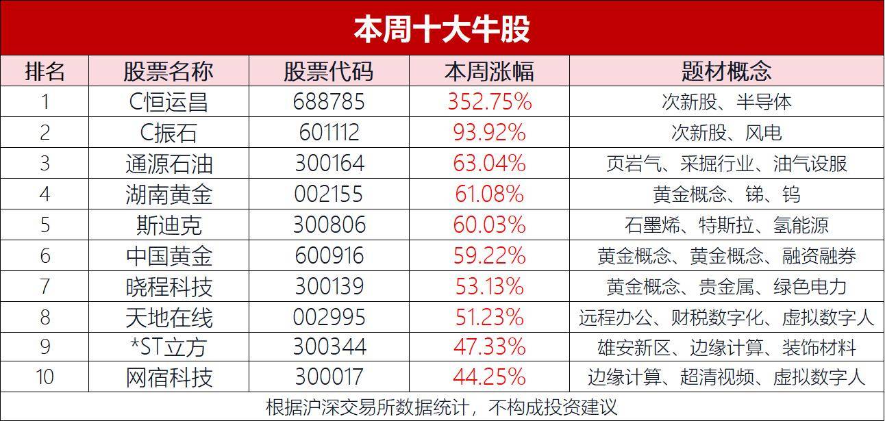 本周十大牛股如下:C恒运昌、C振石、通源石油、湖南黄金、斯迪克、中国黄金、晓程科技、天地在线、*ST立方、网宿科技。