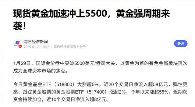 1月29日,国际金价盘中突破5500美元/盎司大关,COMEX黄金期货亦突破4200美元/盎司关口,国内大盘价已经接近1200元人民币/克的