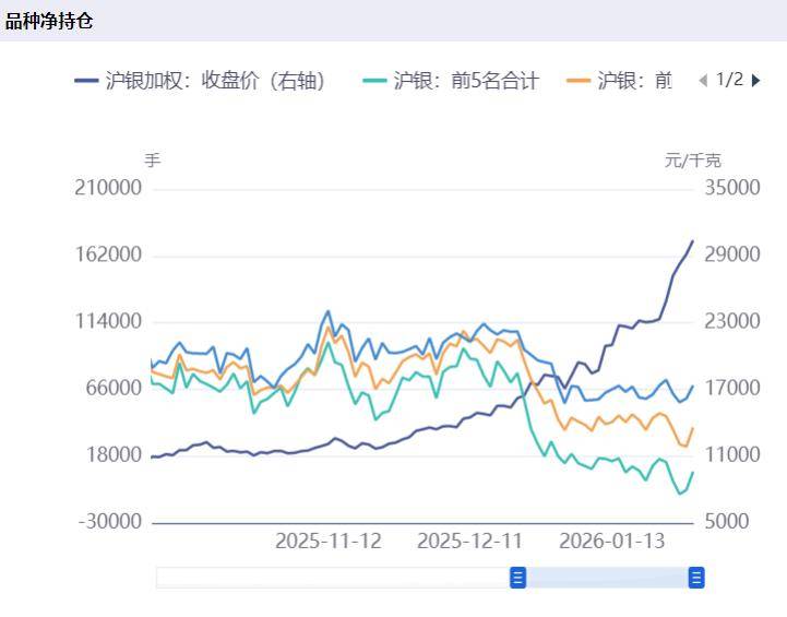 相较而言,国内白银期货多、空持仓量前5名的净持仓在1月27日一度降至净空头为主,净空头持仓量为9377手。不过在随后的两个交易日有所回升,1月28日多、空持仓量前5名净空头持仓6230手,1月29日净多头持仓6929手。