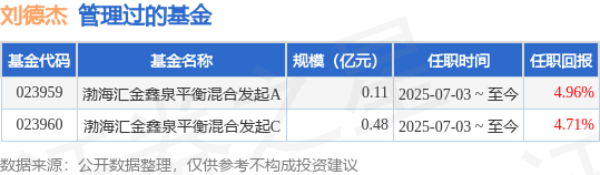 刘德杰先生:对外经济贸易大学本科学历,多年期货和证券从业经历。2012年7月至2015年5月,任职于中国中纺集团公司期货部,从事期货策略研究等工作;2015年5月至2021年1月,任职于信达证券股份有限公司,从事投资助理工作;2021年1月至2024年6月,任职于华金证券股份有限公司,从事资管产品投资经理工作;2024年6月加入渤海汇金证券资产管理有限公司,2024年12月起担任公募固收部信用投资团队基金经理。