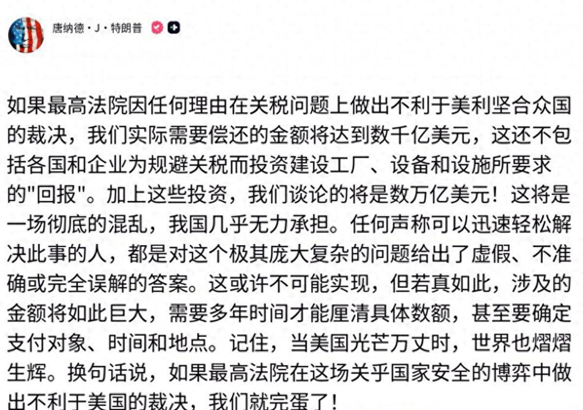 他在社交媒体上详细算了一笔账:万一最高法院裁定他的关税政策无效,光是直接赔偿就可能高达数千亿美金。