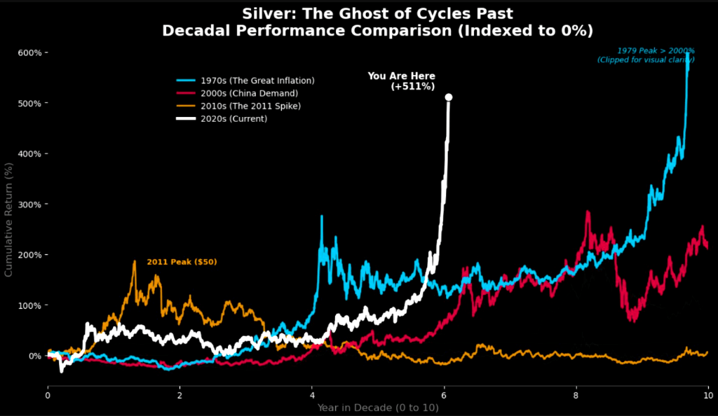 在之前的两个主要牛市周期中,截至第6年的累积回报率分别为145%(1970年代)和40%(2000年代)。相比之下,2020年代至今的白银累积回报率已高达520%。这一数据表明,本十年的白银市场并非仅仅是历史的简单重复,而是进入了一个完全不同的量级,其爆发力远超以往任何时期。