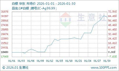 截止2026年1月30日白银市场价格30098.67元/千克,较1月29日市场价格30644.67元/千克,下跌1.78%。