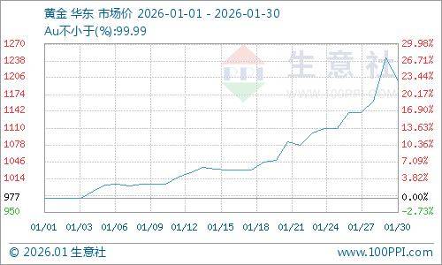 据生意社商品行情分析系统,截止2026年1月30日黄金现货市场价格1199.84元/克,较1月29日市场价格1243.4元/克,下跌3.5%。