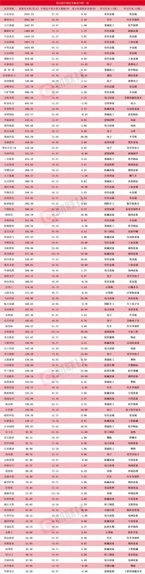 财联社1月24日讯(编辑 平方)据Choice数据统计显示,包括山东黄金、潍柴动力、宝丰能源、藏格矿业、中金黄金、兴业银锡、中钨高新、山金国际、铜陵有色、信维通信、新和成、信科移动-U、协创数据、赤峰黄金、中矿资源、麦格米特、桂冠电力、罗博特科、亚钾国际、华新建材、厦钨新能、世运电路、臻镭科技、兆驰股份、奥比中光-UW、宏和科技、三美股份、万辰集团、华曙高科、九丰能源、东方铁塔、盛达资源、华锡有色、西部黄金等在内的101家A股上市公司周五盘中创出历史新高(前复权),具体详见下图:
