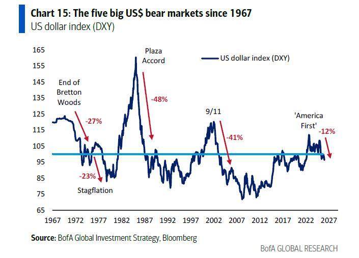 尽管周五美元汇率出现了反弹,但Hartnett指出,自特朗普就职以来,美元实际上已经下跌了12%。这种疲软并非偶然,而是一种政策导向。 弱势美元被视为提振宾夕法尼亚、密歇根和威斯康星等“铁锈地带”摇摆州制造业的关键手段。