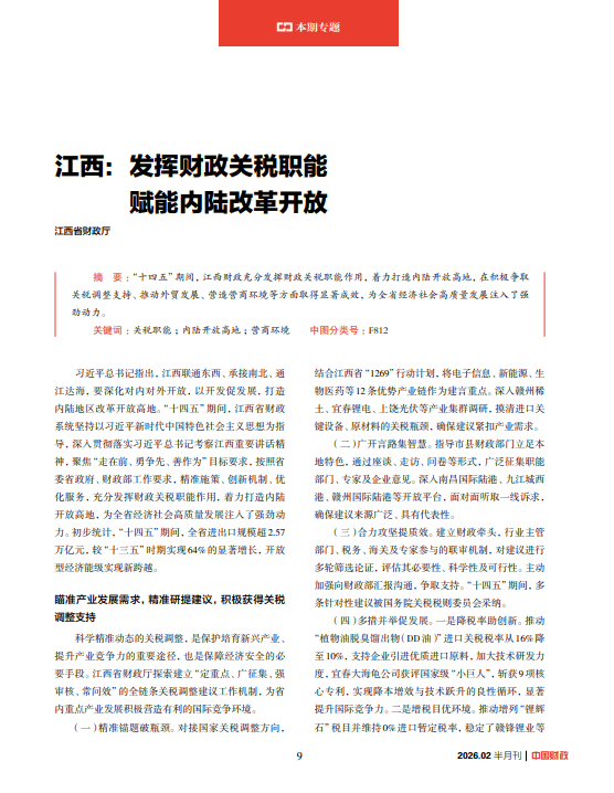 摘要:“十四五”期间,江西财政充分发挥财政关税职能作用,着力打造内陆开放高地,在积极争取关税调整支持、推动外贸发展、营造营商环境等方面取得显著成效,为全省经济社会高质量发展注入了强劲动力。