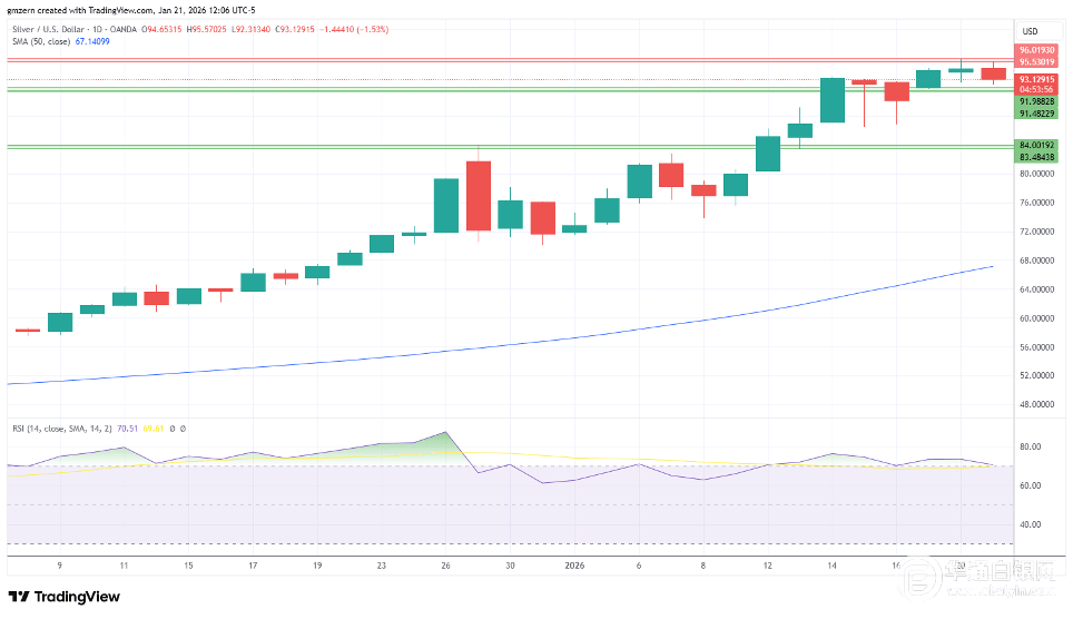 倘若白银价格跌破91.50美元至92.00美元支撑位,则将会向87.00美元移动。