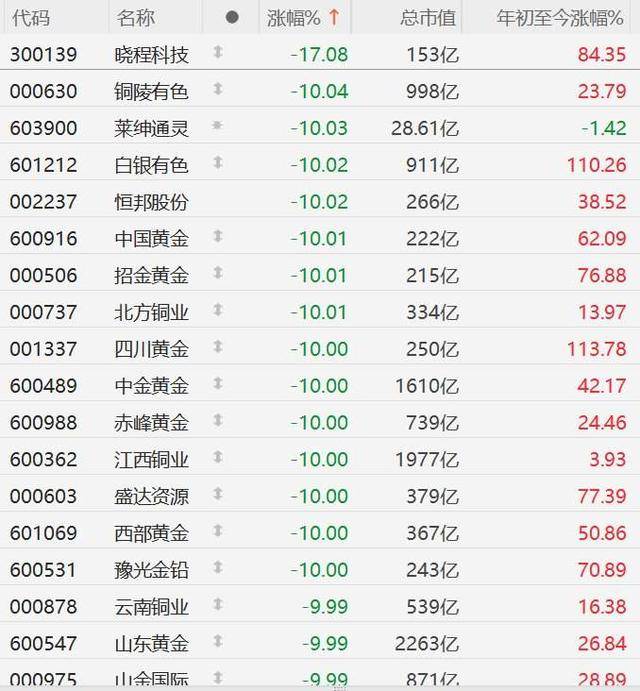 A股市场黄金概念股大面积跌停,其中,晓程科技跌17%,铜陵有色、莱绅通灵、白银有色、恒邦股份、中国黄金、招金黄金、北方铜业、四川黄金、中金黄金、赤峰黄金、江西铜业、盛达资源、西部黄金、豫光金铅、云南铜业、山东黄金、山金国际、株冶集团、湖南白银、贵研铂业、萃华珠宝、鹏欣资源等逾20股10CM跌停。