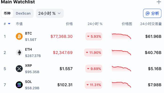 2月1日凌晨,比特币跌破8万美元关口,整个加密资产跌势加深。其他代币跌幅更大:第二大数字资产以太坊下跌超过10%,Solana跌超11%。