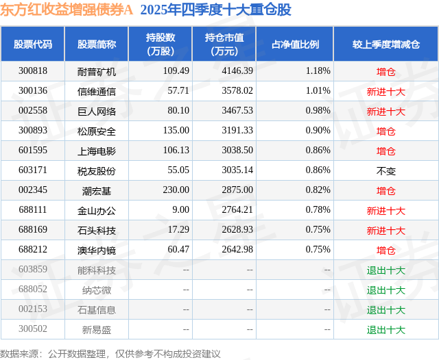 东方红收益增强债券A的前十大重仓股如下: